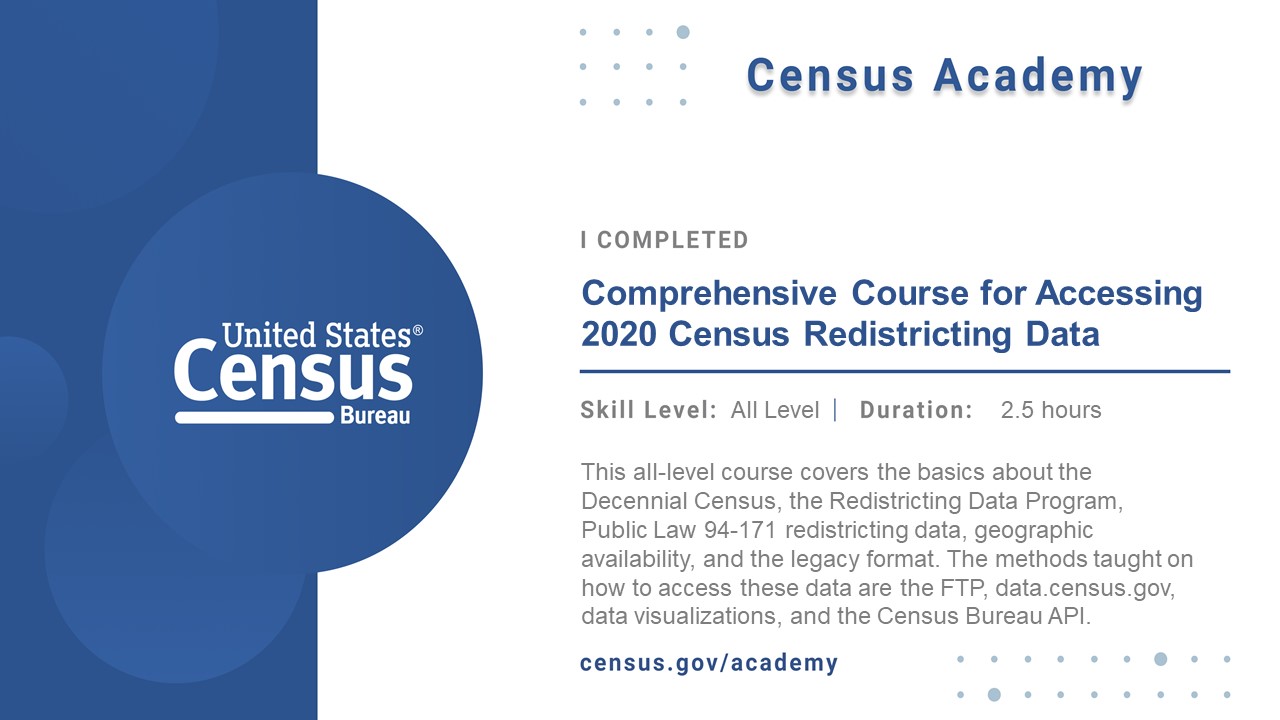 I just finished the Comprehensive Course for Accessing 2020 Census Redistricting Data with  Census Academy! Be sure to check out their free resources!