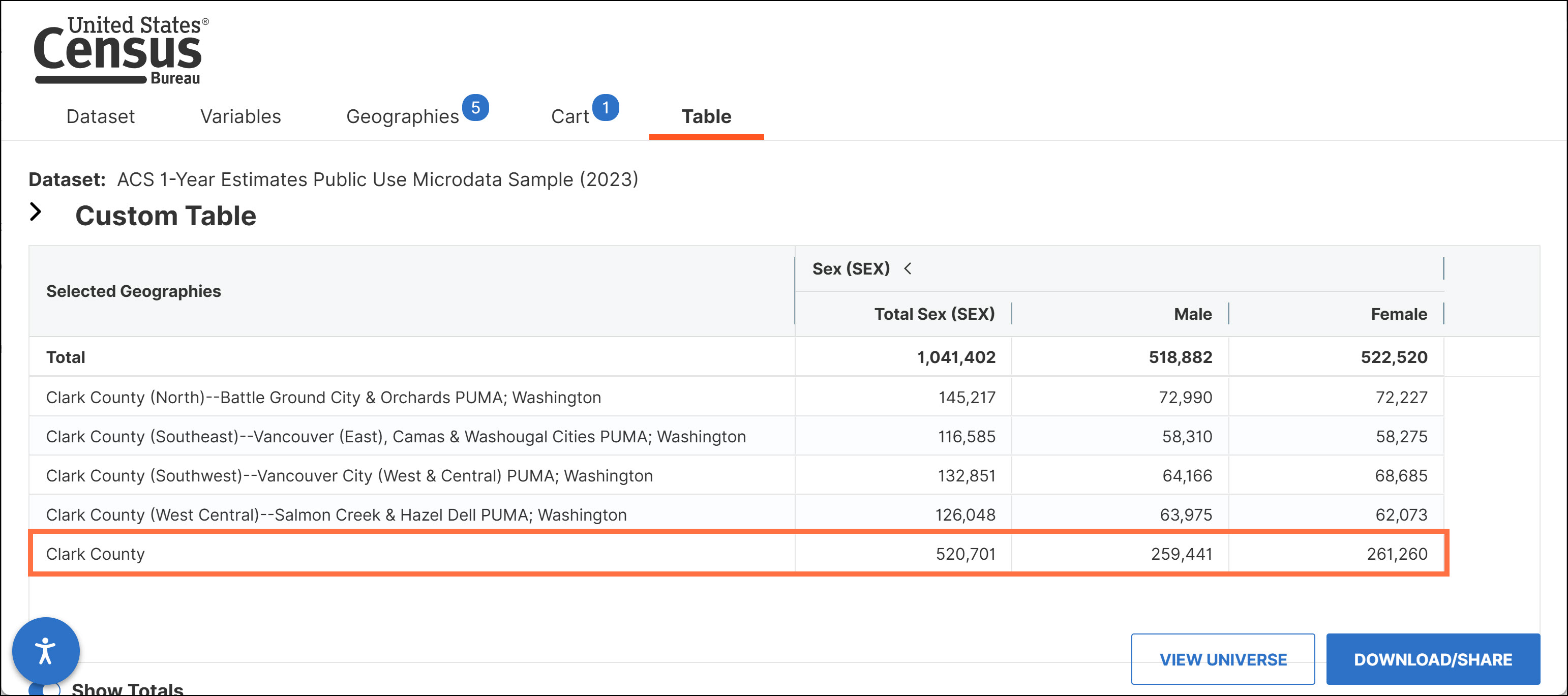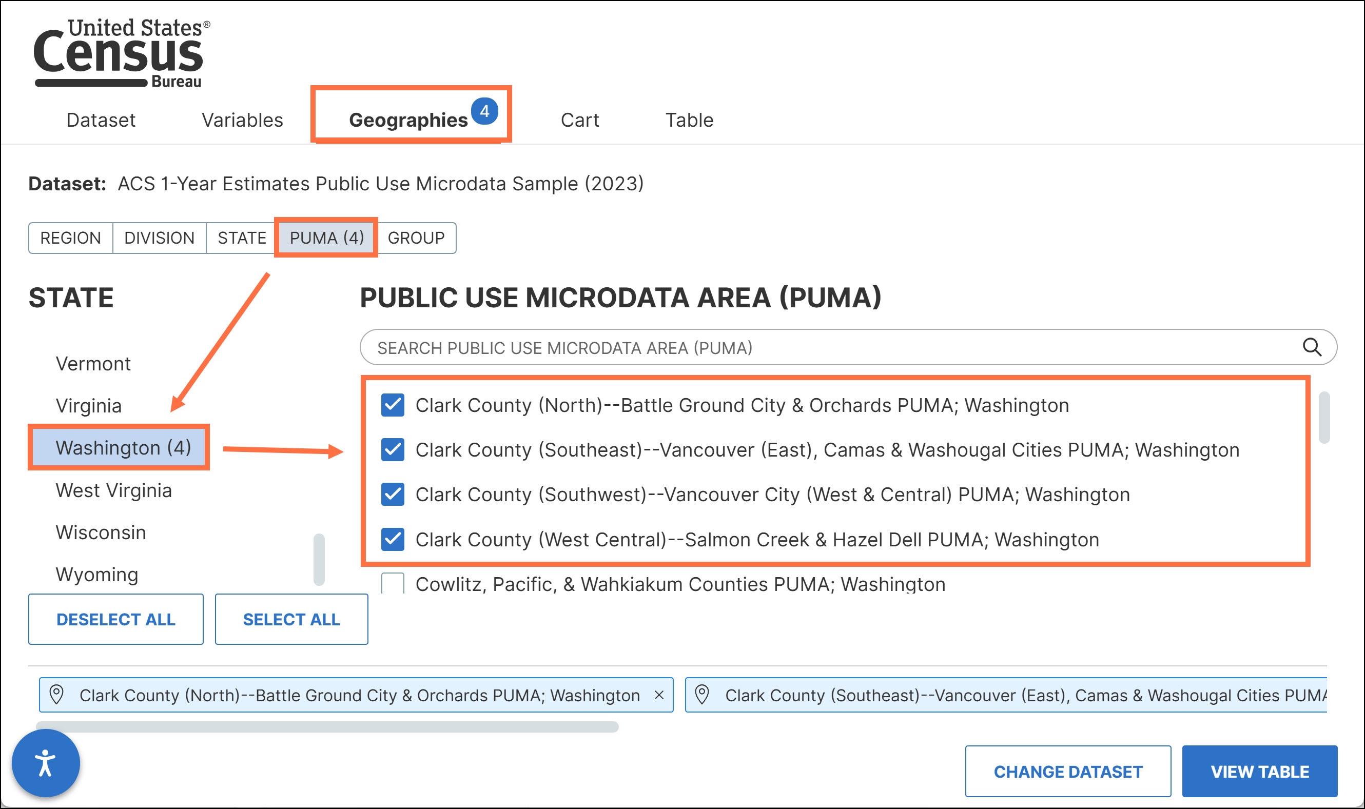 For example: Geographies → PUMA → Washington → select the four PUMAs in Clark County, WA
