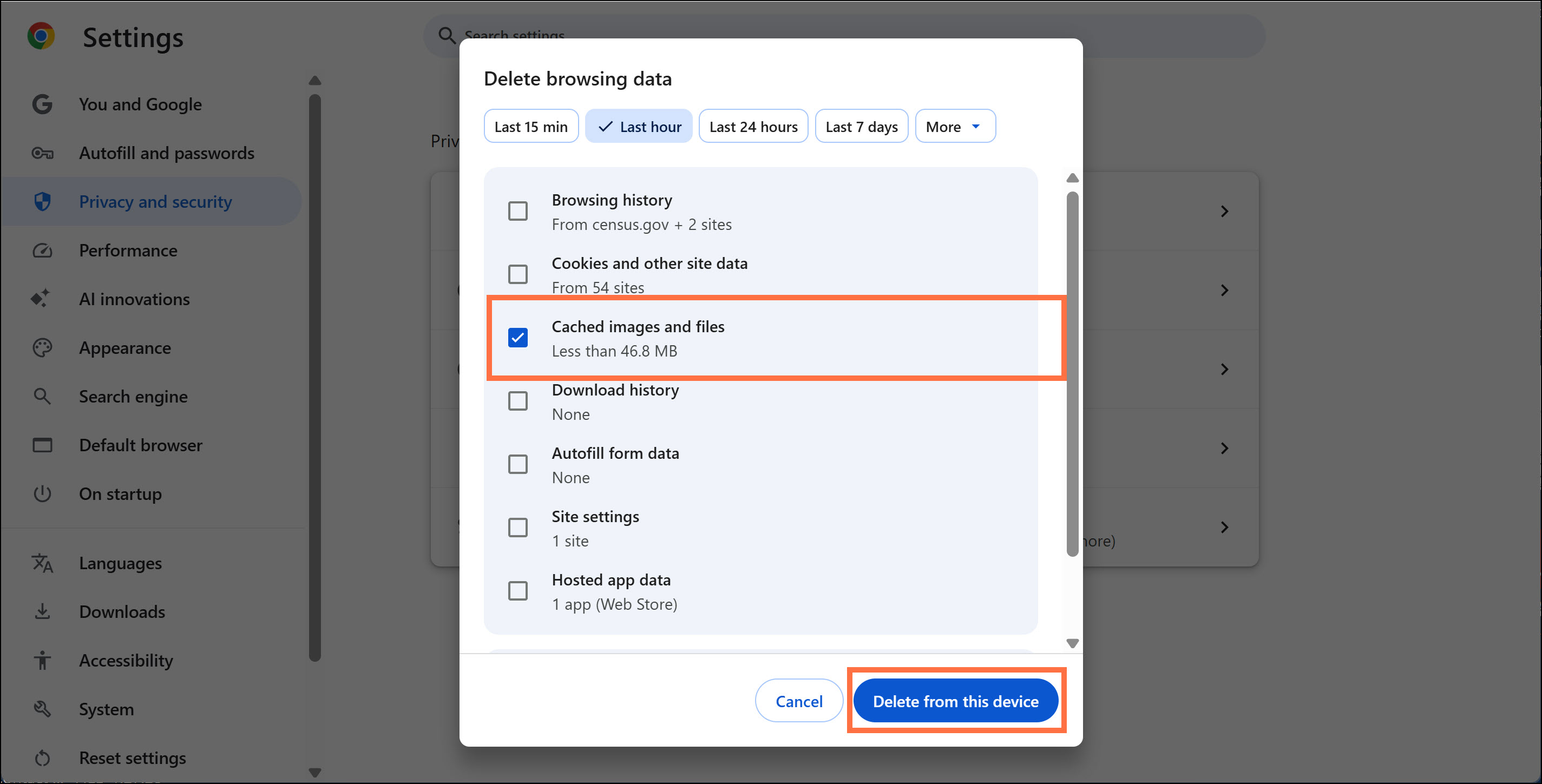 3. Make sure that the box next to “Cached images and files” is checked and click the “Delete data” button.