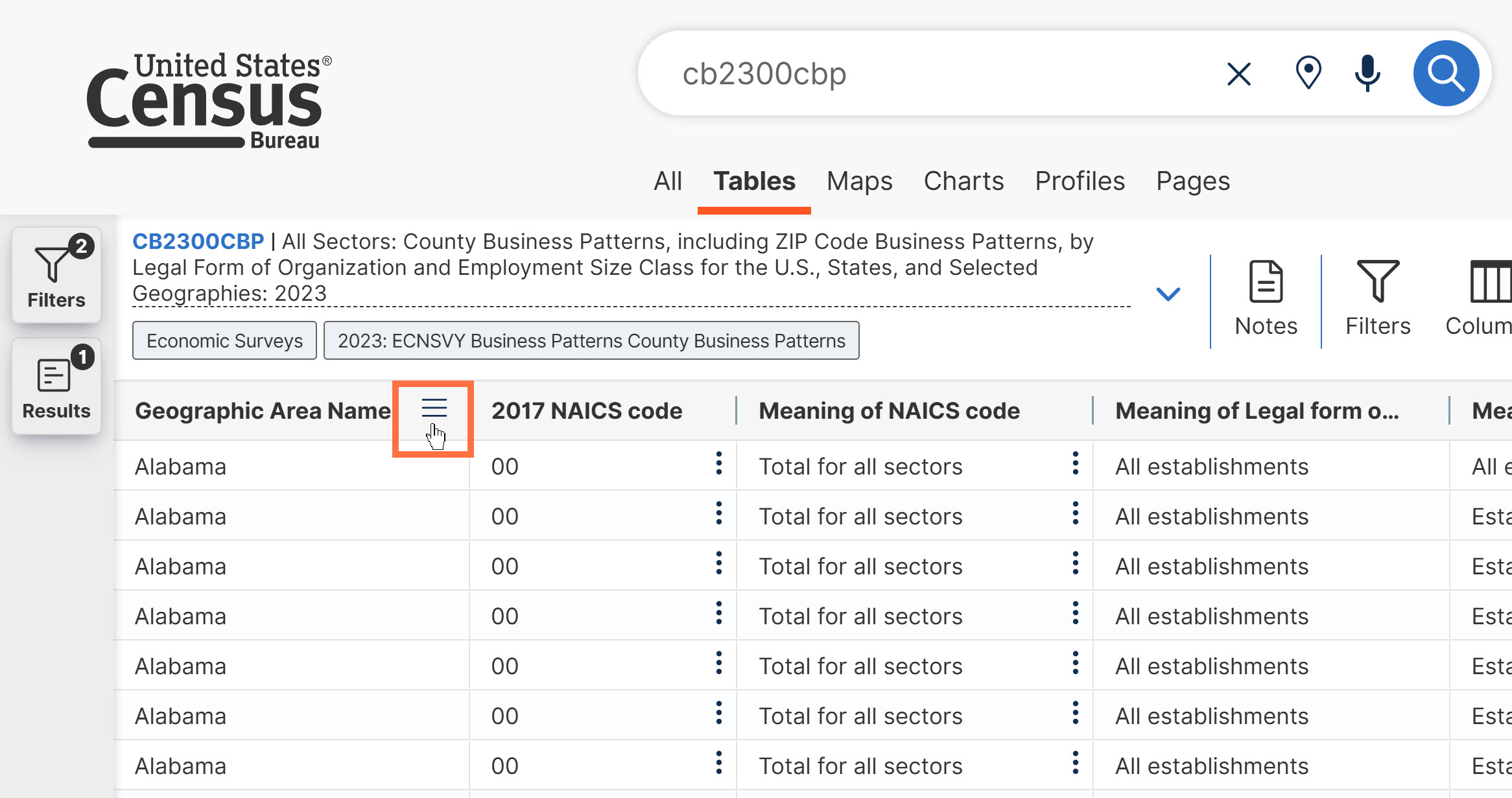 Functionality on data.census.gov allows you to pin columns in a table so it stays in view as you scroll horizontally. You freeze the column by following these steps: