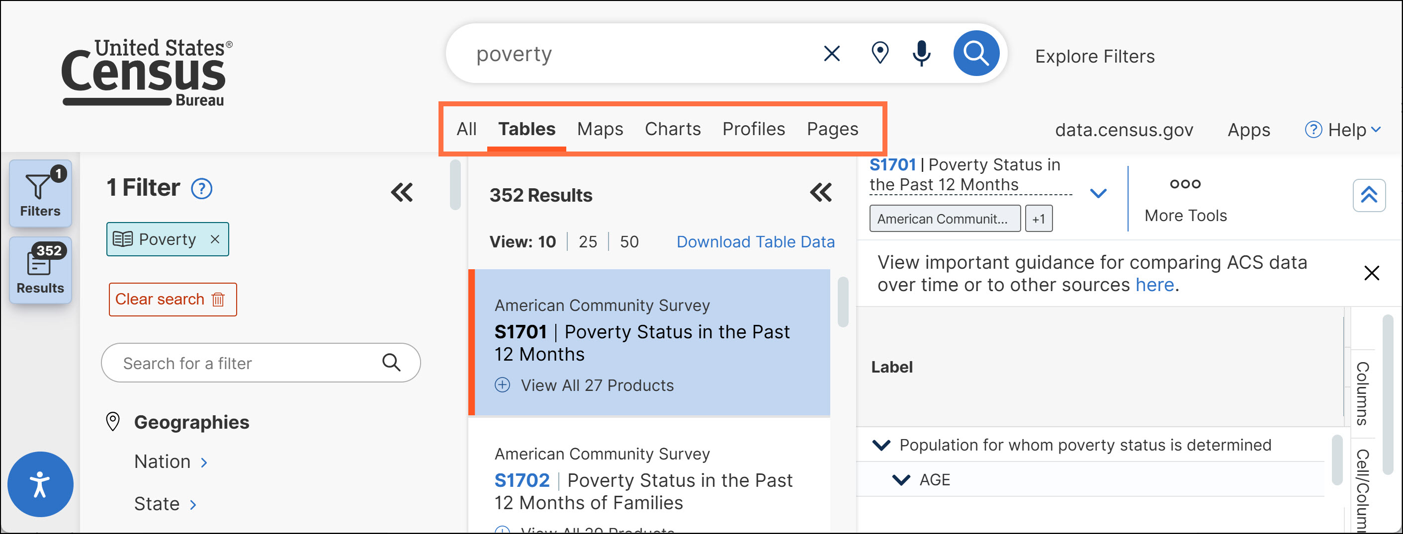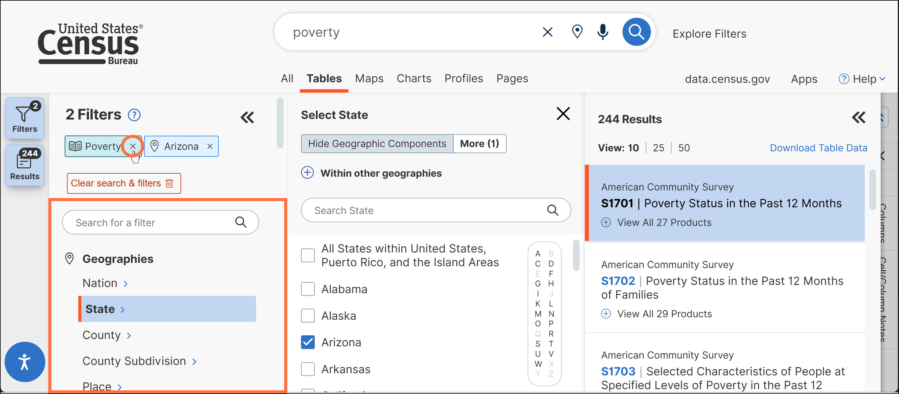 o Collapse the Filters/Results panels when you want to see more of the table, map, or chart across your screen