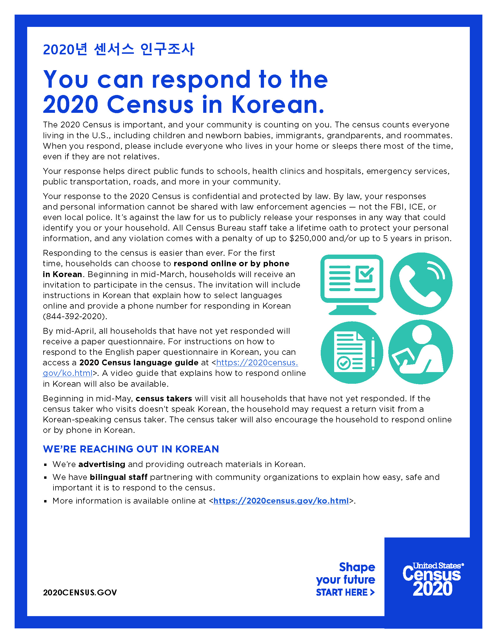 You can respond to the 2020 Census in Korean / 귀하께서는 한국어로 2020 년 센서스 인구조사에 응답하실 수 있습니다.