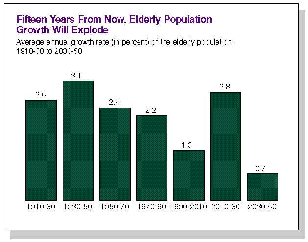 America's elderly population is now growing at a moderate pace. But not too far into the future, the growth will become rapid. So rapid, in fact, that by the middle of the next century, it might be completely inaccurate to think of ourselves as a Nation of the young: there could be more persons who are elderly (65 or over) than young (14 or younger)!