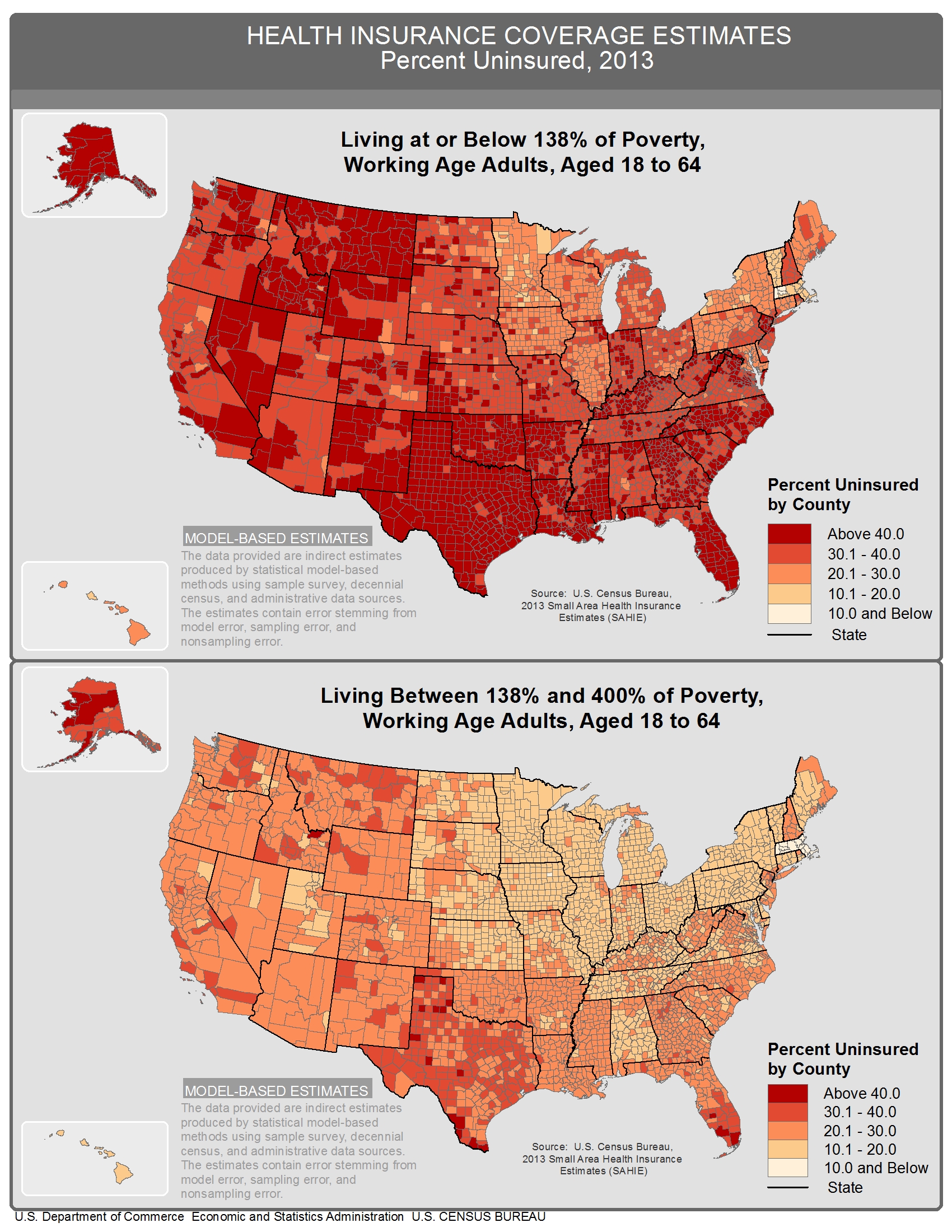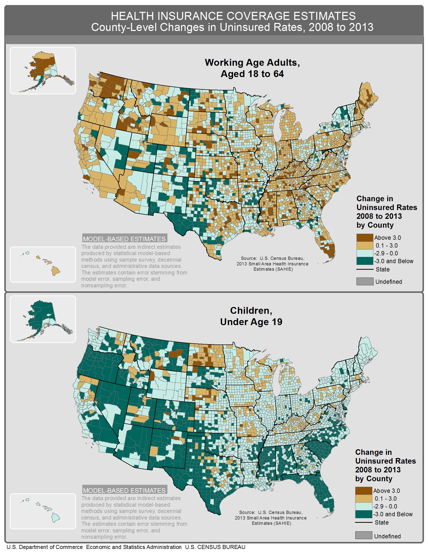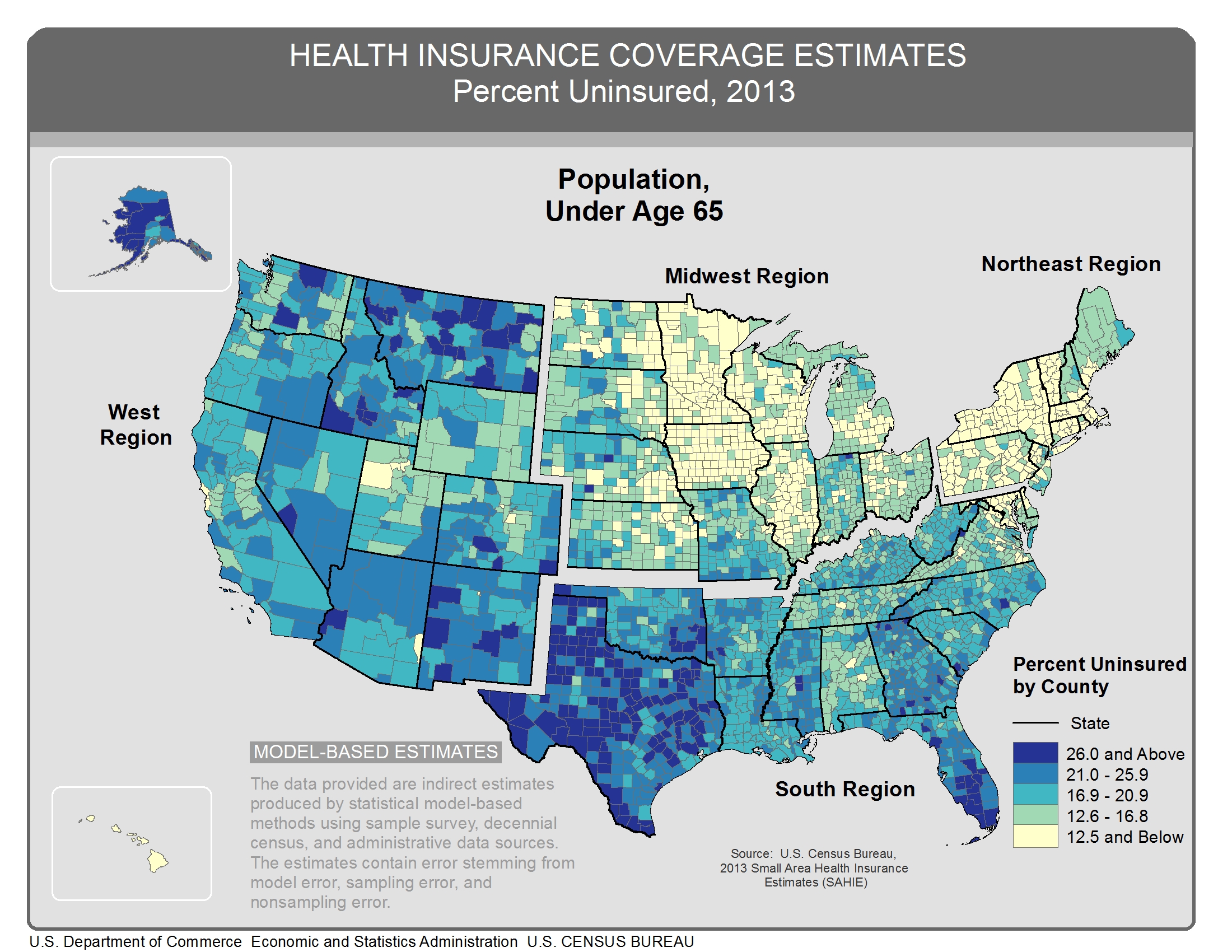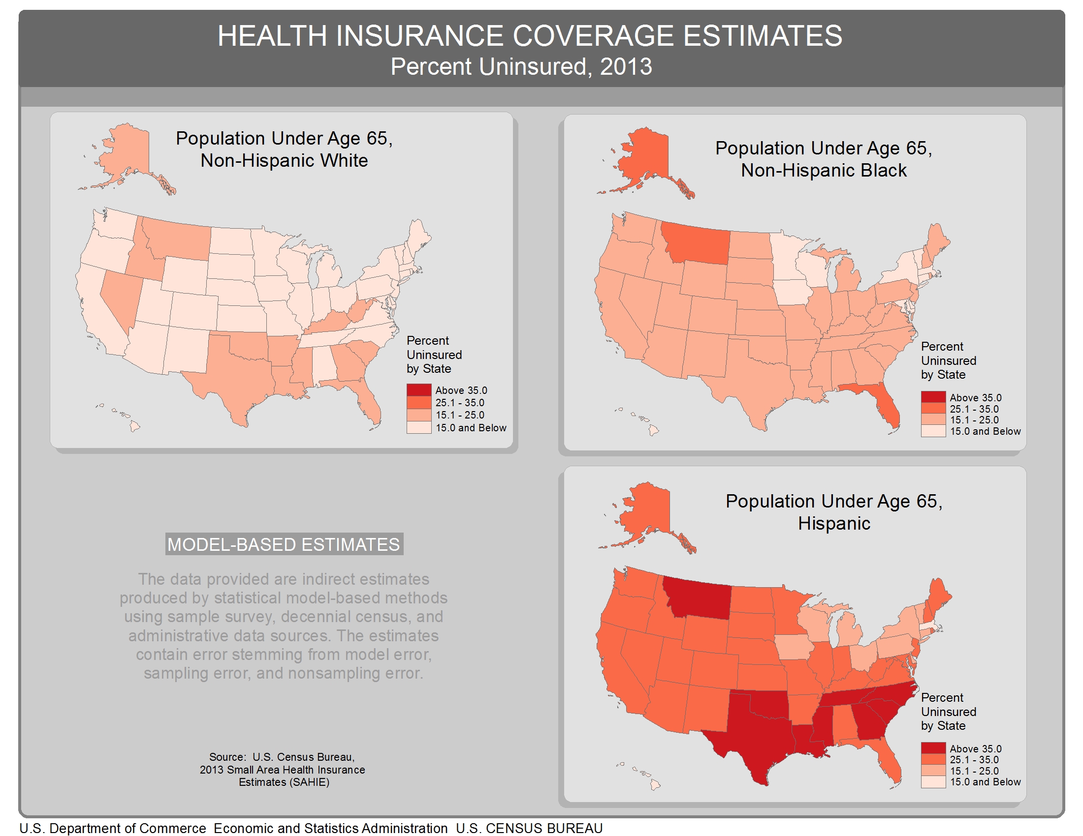 This report provides a summary of the 2013 release of the U.S. Census Bureau’s Small Area Health Insurance Estimates (SAHIE) program. SAHIE is the only source of data for single-year estimates of health insurance coverage status for all counties in the United States. The report describes demographic and economic differences in health insurance status across states and counties, as well as trends in health insurance coverage.