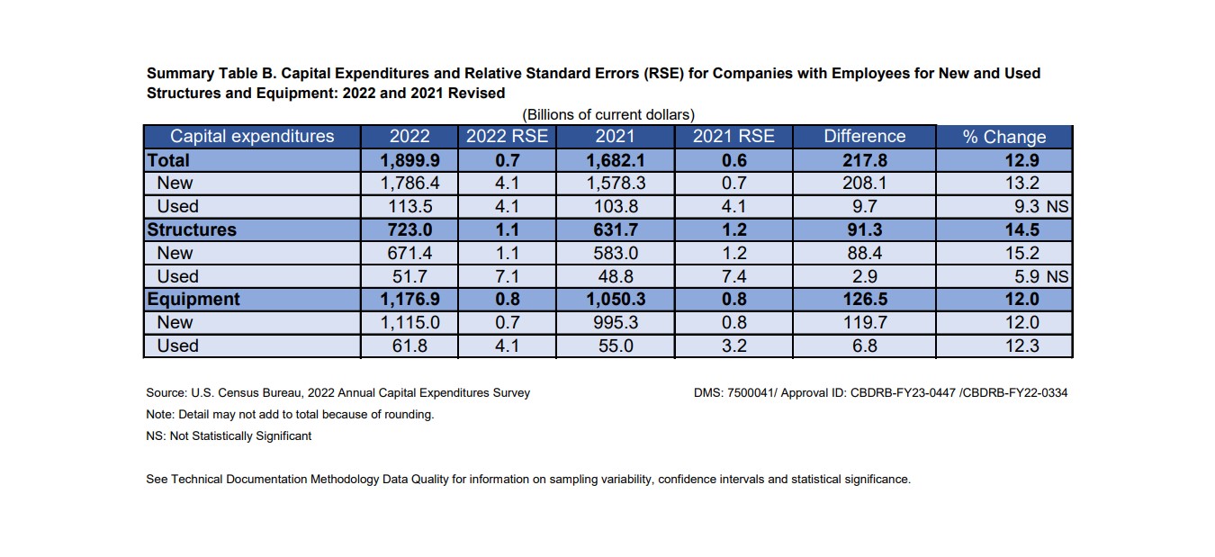 In 2022, U.S. nonfarm employer businesses invested $1,899.9 billion in new and used structures and equipment, an increase of $217.8 billion (12.9 percent) from the revised 2021 employer total of $1,682.1 billion. Total spending on new structures and new equipment was $1,786.4 billion, an increase of $208.1 billion (13.2 percent) from the revised 2021 total of $1,578.3 billion. Total spending on used structures and used equipment was $113.5 billion, not statistically different from the revised 2021 total of $103.8 billion.   (See Summary Table B below, and Tables 1a and 1b).