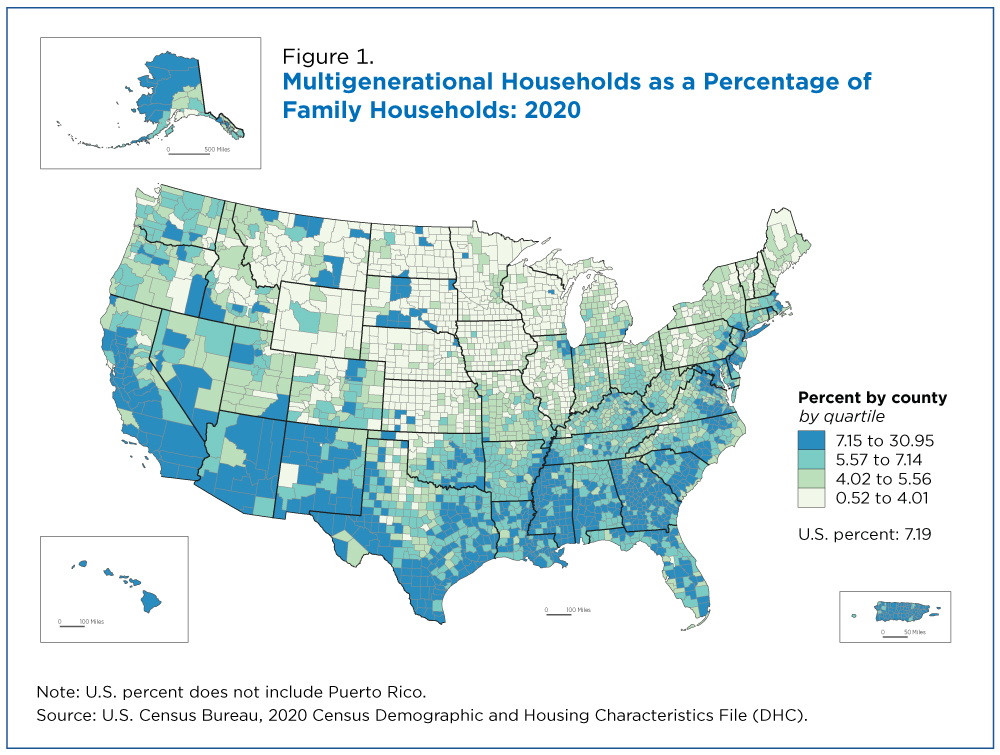 While 2020 Census data show that 7.2% of all family households were multigenerational nationwide, county level percentages are wide-ranging, from 0.5% to 31.0%.