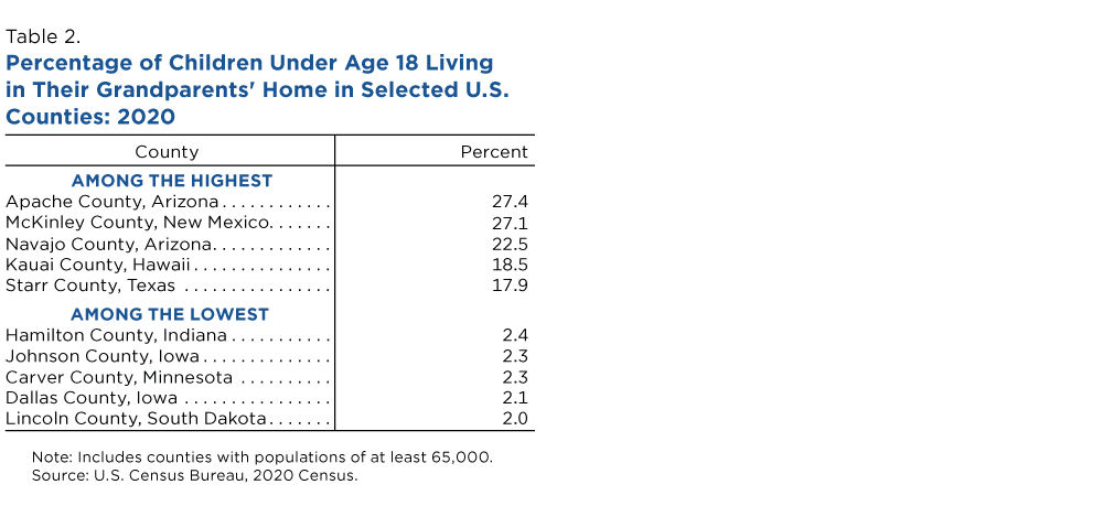 The five counties with the greatest shares of children living with their grandparents were predominantly in the West, and those with the smallest shares were all in the Midwest.