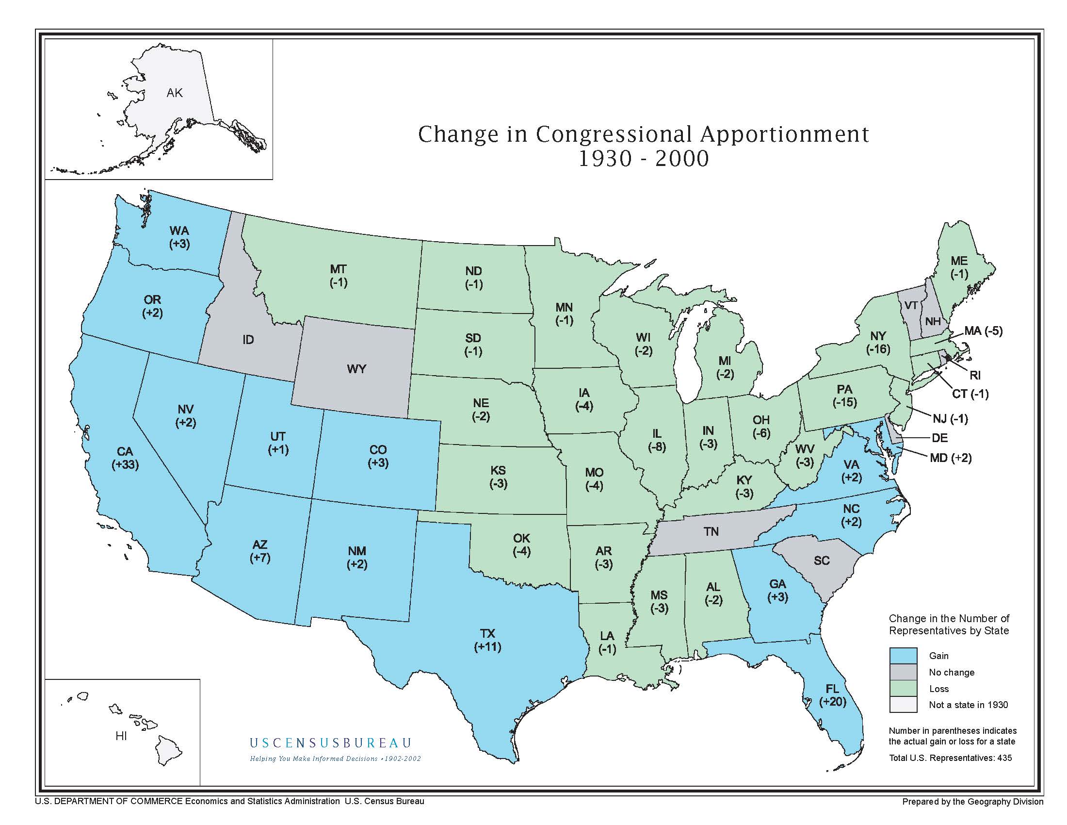 Apportionment is the process of dividing the 435 memberships, or seats, in the House of Representatives among the 50 states. At the conclusion of each decennial census, the results are used to calculate the number of House memberships to which each state is entitled. This map shows the change to the number of Congressional seats for each state between apportionment based on the 1930 Census and apportionment based on the 2000 Census.