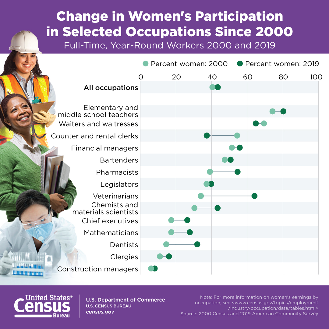 2000 Census and 2019 American Community Survey. For more information on Women's Earning's by Occupation, see www.census.gov/topics/employment/industry-occupation/data/tables.html