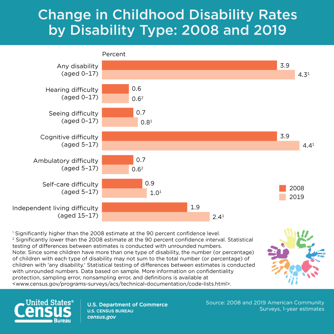 Note: Since some children have more than one type of disability, the number (or percentage) of children with each type of disability may not sum to the total number (or percentage) of children with 'any disability.' Statistical testing of differences between estimates is conducted with unrounded numbers. Data based on sample. More information on confidentiality protection, sampling error, nonsampling error, and definitions is available at <www.census.gov/programs-surveys/acs/technical-documentation/code-lists.html>.