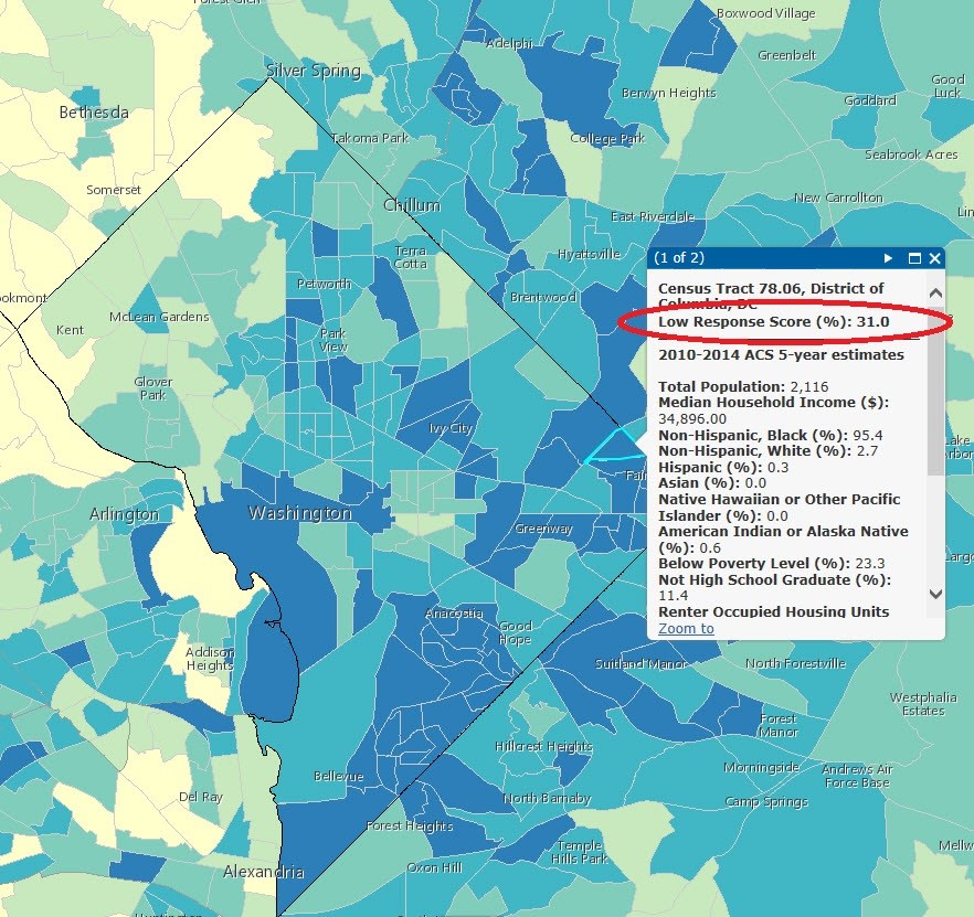 Response Outreach Area Mapper display showing the LRS and select 2010-2014 American Community Survey five-year estimates for a selected census tract in Northeast Washington, D.C.