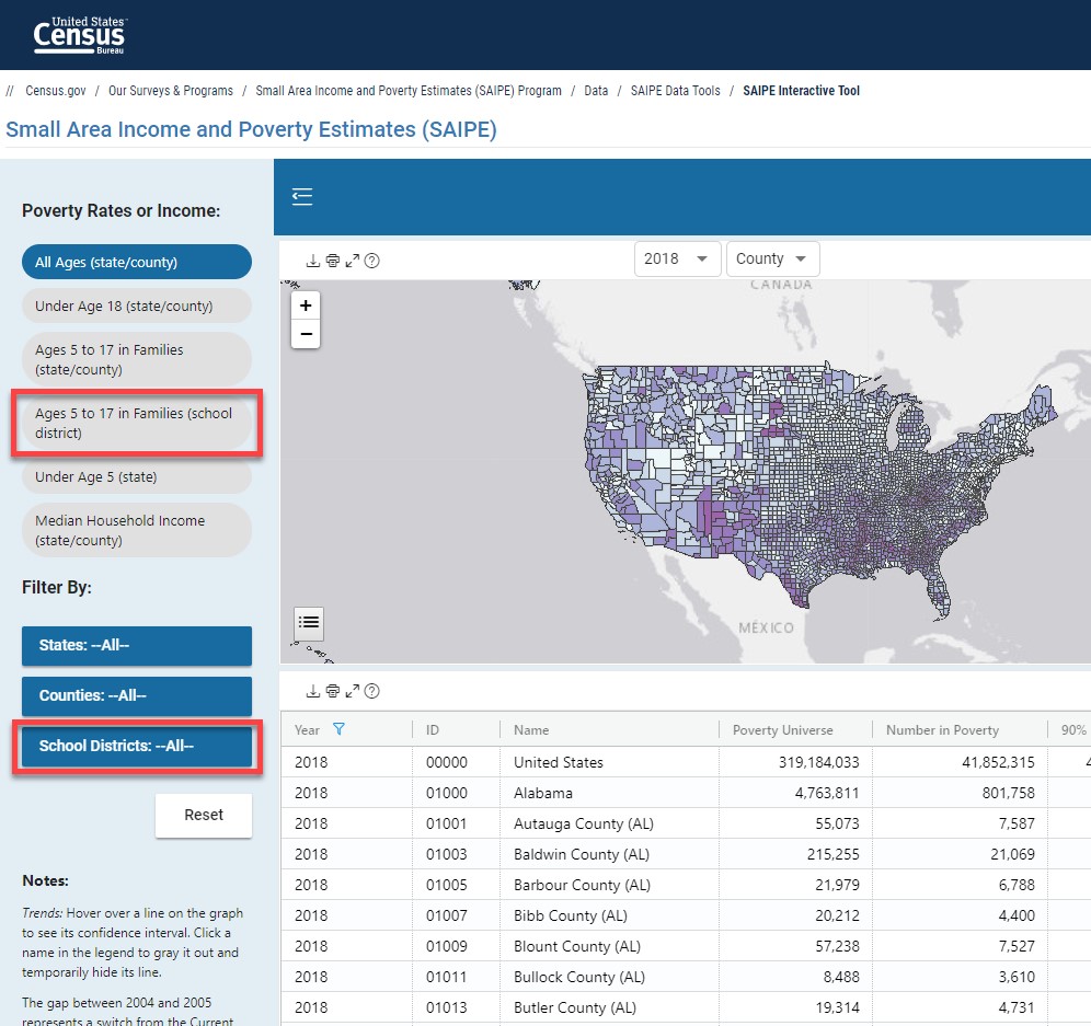 The boundaries on our SAIPE interactive tool are generalized boundaries to allow for faster loading times, and are not suited for boundary review. However, the table contains a link unique to each district that will display detailed boundaries. To use the interactive tool and view school district information, follow these steps: