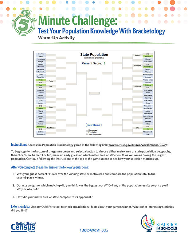 This activity uses our Population Bracketology game to test students’ knowledge of our nation’s population data. Students can play with state or metro area data – and then see which place will win with the largest population as they select options on the bracket. After completing the game, they answer questions about their experience.