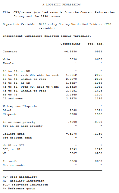 In order to obtain equations that calculate the probability that a person on the 1990 census file has difficulty seeing the words and letters in ordinary newspaper print (or has some other specific disability), we used the CRS/census file to fit logistic regressions.